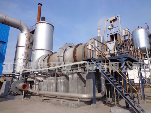 采用重油、廢溶劑為加熱介質(zhì)。將在流化造粒塔生成的含有機物的混合污鹽加入回轉(zhuǎn)焙燒爐內(nèi)焙燒。在高溫下污鹽中的有機物氣化熱解。焙燒后的無機鹽外送綜合利用或填埋。焙燒產(chǎn)生的煙氣經(jīng)焚燒爐二次焚燒,將煙氣中有機物完全氧化成CO2、H2O、HCl、S